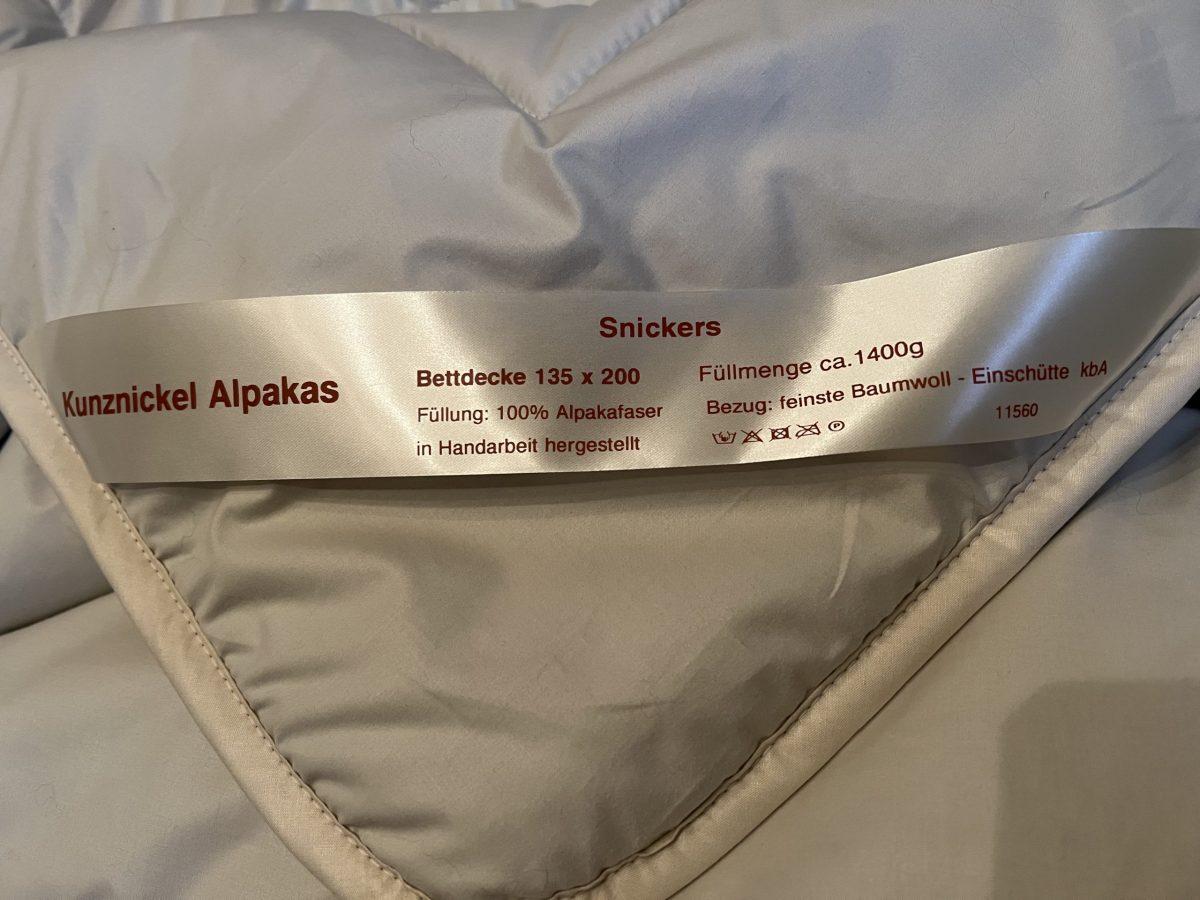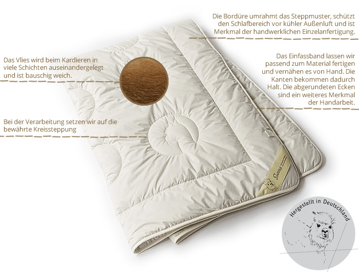 Um die Wärme- und Feuchtigkeitsregulierung beim Schlafen optimal nutzen zu können, ist es erforderlich, Bettwäsche ohne Chemiefasern zu verwenden. Zudem fördern Chemiefasern in Bett- und Nachtwäsche die statische Aufladung der Alpakawolle und es kommt zu vermehrten Faserdurchbrüchen an den Nähten. Vereinzelte Faserdurchbrüche sind hingegen kein Anlass zur Sorge. Da der Hersteller auf eine naturbelassene Baumwolle wert legt und diese nicht chemisch ausgerüstet wird, ist dies technologisch nicht zu umgehen.