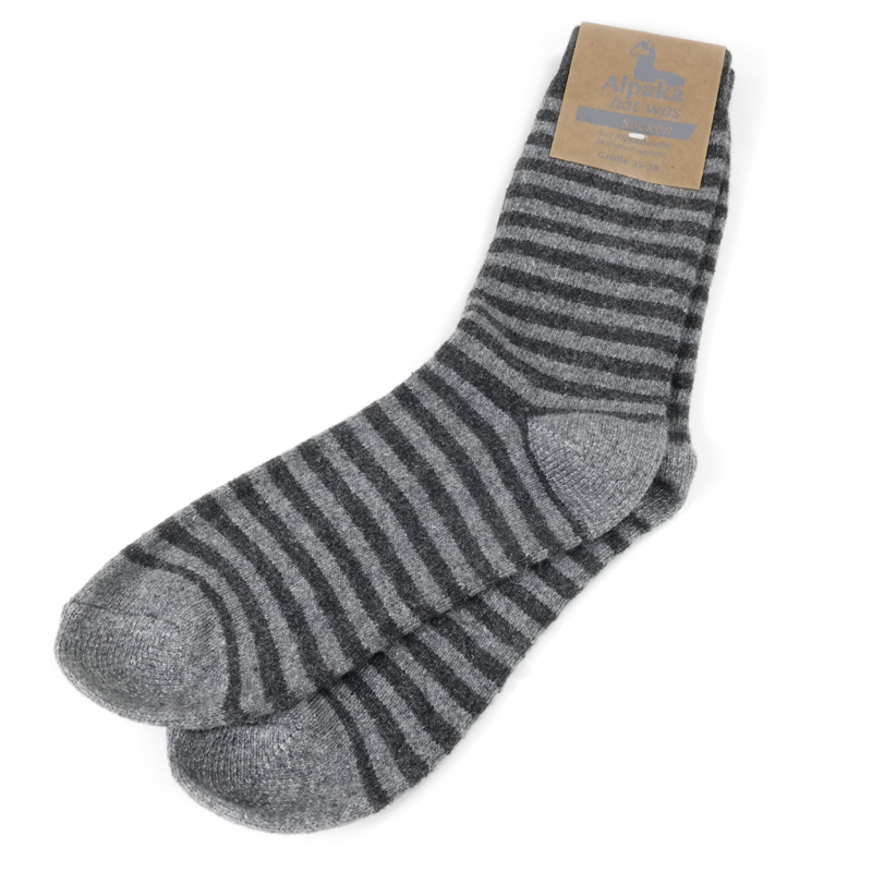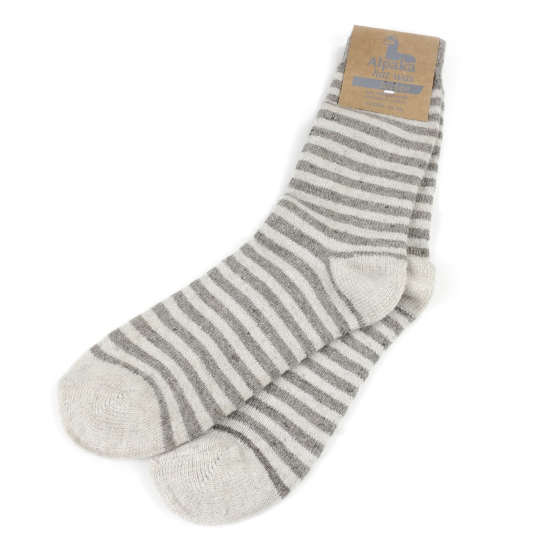 Diese witzigen Ringelsocken sind dünner gestrickt als unsere dicken Alpakasocken und passen deshalb auch in Schuhe mit weniger Platz.