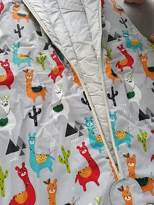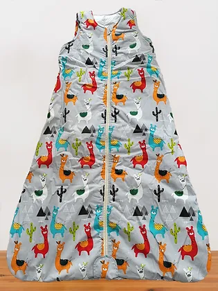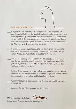 Der Schlafsack hält die Körpertemperatur des Babys konstant. Er ist mit einem Mittelreißverschluss sowie einem Halsschutz gearbeitet. Die Armlöcher sind durch Druckknöpfe regulierbar und so zum Mitwachsen geeignet. Alle Schlafsäcke sind aus reiner Baumwolle gearbeitet. Der Innenstoff ist immer eine Biobaumwolle. Die Füllung besteht natürlich aus feinster Alpakawolle.