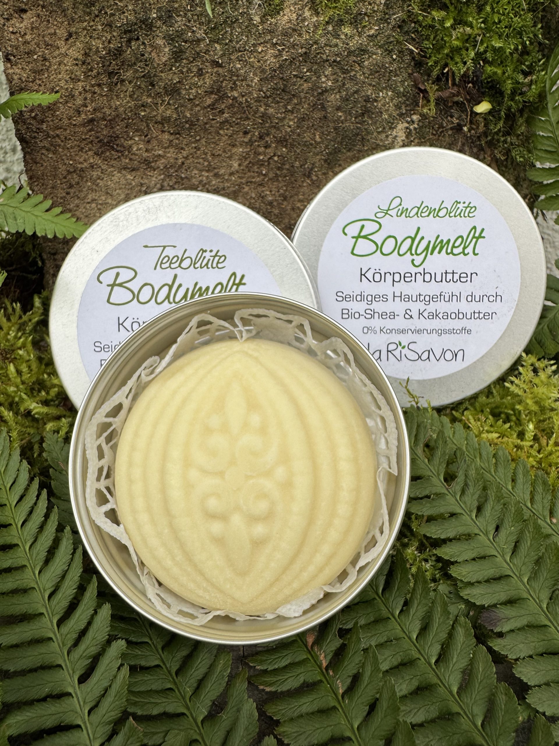 Die Bodymelt-Körperbutter ist eine feste Körperbutter zur Hand- und Fußpflege, Körper- und Haarpflege, auf trockene und nasser Haut. Pflege vom Kopf bis zu den Füßen.
