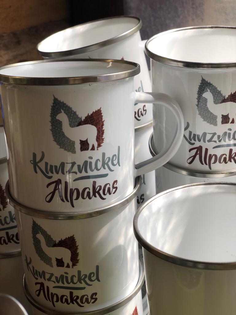 Wunderschöne Emaille-Tasse mit silbernen Rand und unserem doppelseitigen Farmlogo „Kunznickel Alpakas“