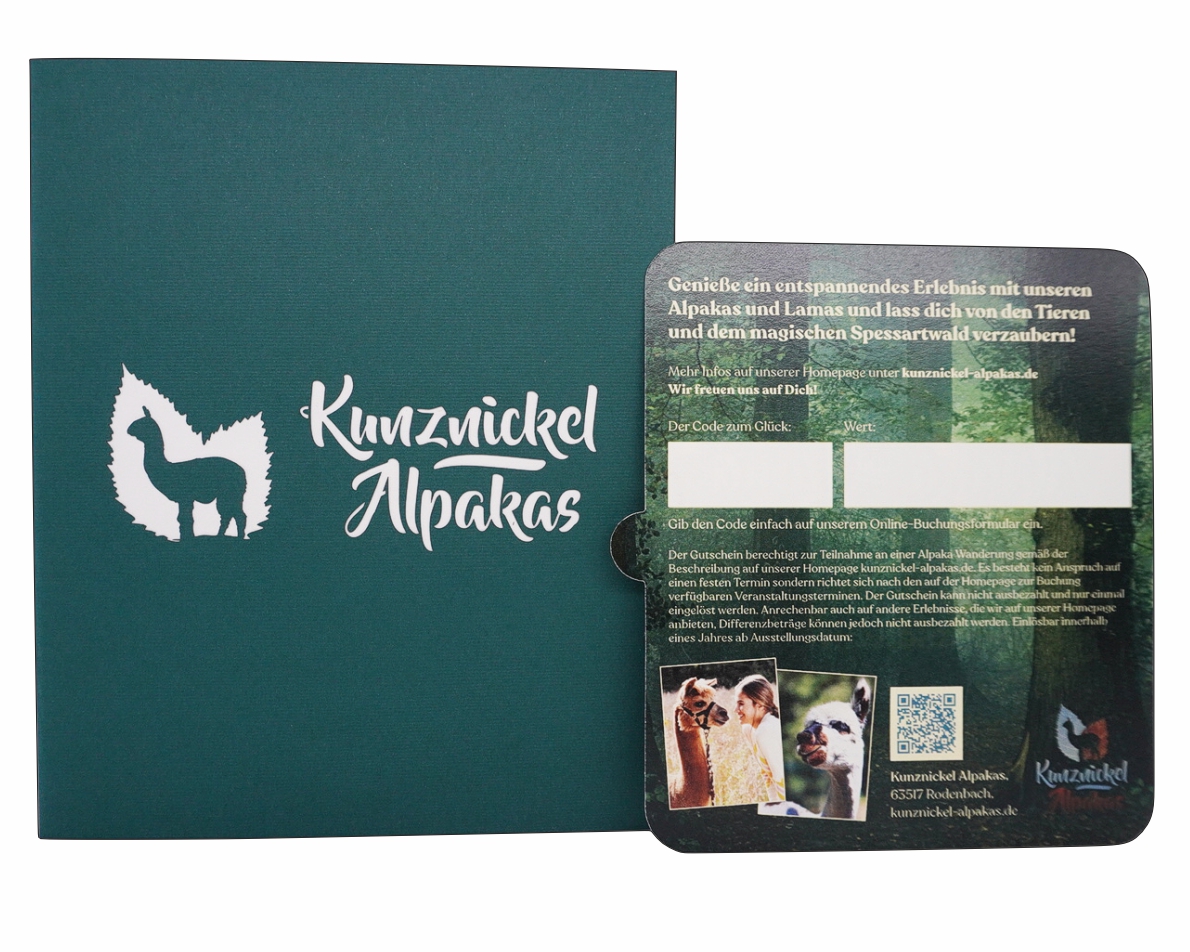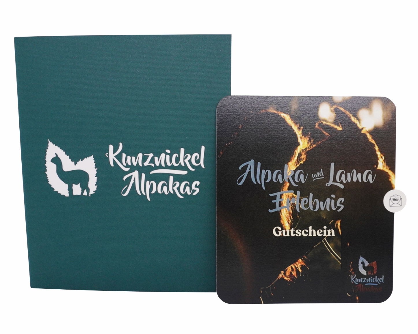 Du erhälst einen schön gestalteten Geschenk-Gutschein mit dem der Beschenkte auf www.kunznickel-alpakas.de einen festen Termin vereinbaren kann. Der Gutschein ist auf jedes Event einlösbar, es ist der bestellte Betrag hinterlegt.
