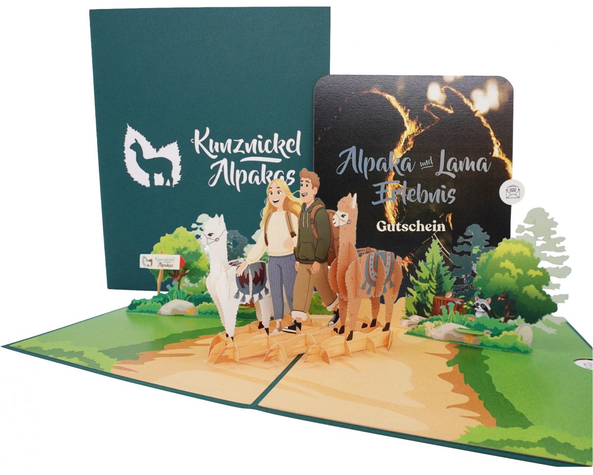 Du erhälst einen exklusiven 3D Pop-UP Gutschein mit dem der Beschenkte auf www.kunznickel-alpakas.de einen festen Termin vereinbaren kann.